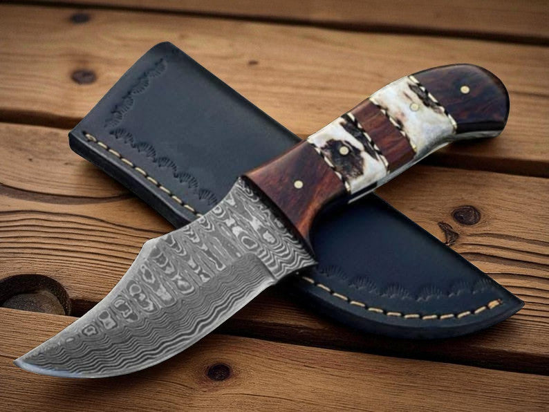 Custom Handmade Damascus Steel Skinning EDC Knife With Rosewood & Bone Handle, 6.25-inch Discover the...