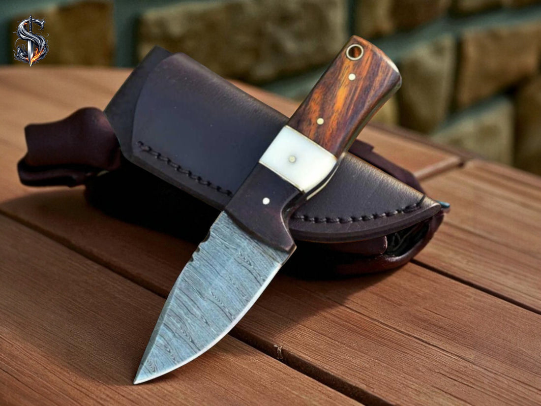 Custom Handmade Damascus Steel EDC Skinning Knife | Rosewood Handle | 7 Inches | Leather...