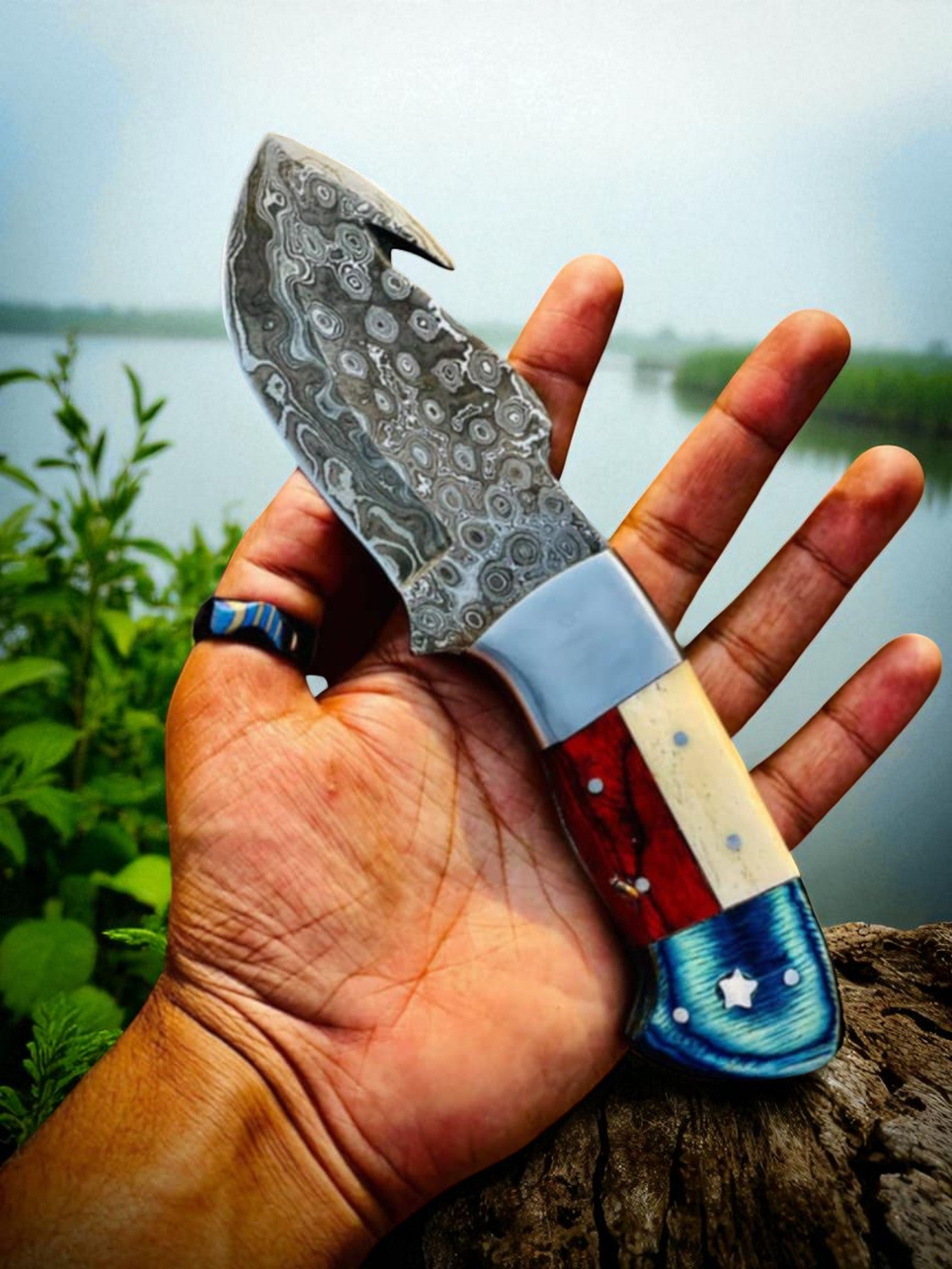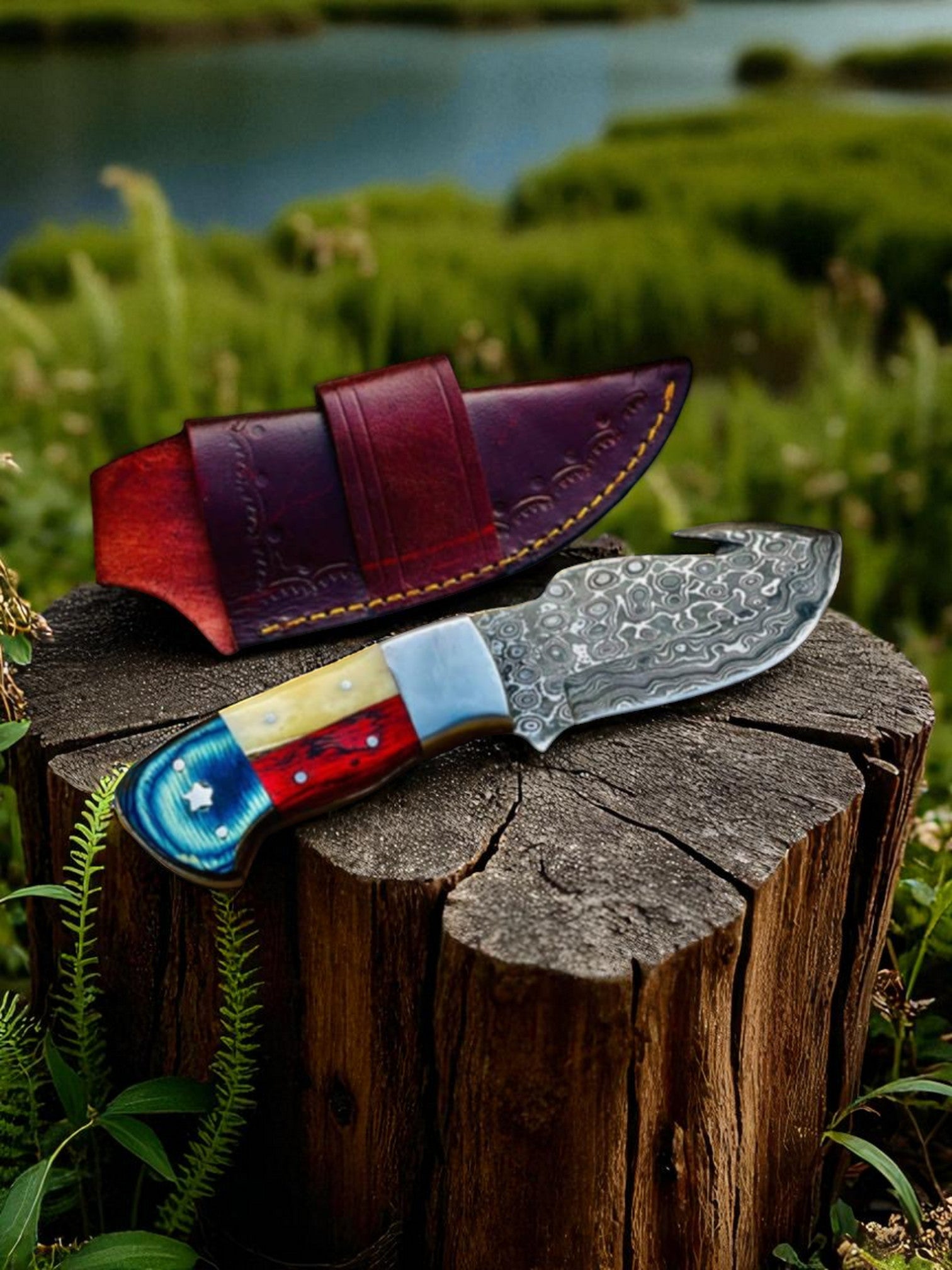 An Amazing Custom Handmade Texas Handle Damascus Steel Gut Hook Deer Hunting Skinning knife.