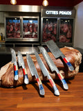An Amazing Custom Hand Made Texas Flag Handles Hand Forged Damascus Steel BBQ/Chef/Kitchen Knife Set.